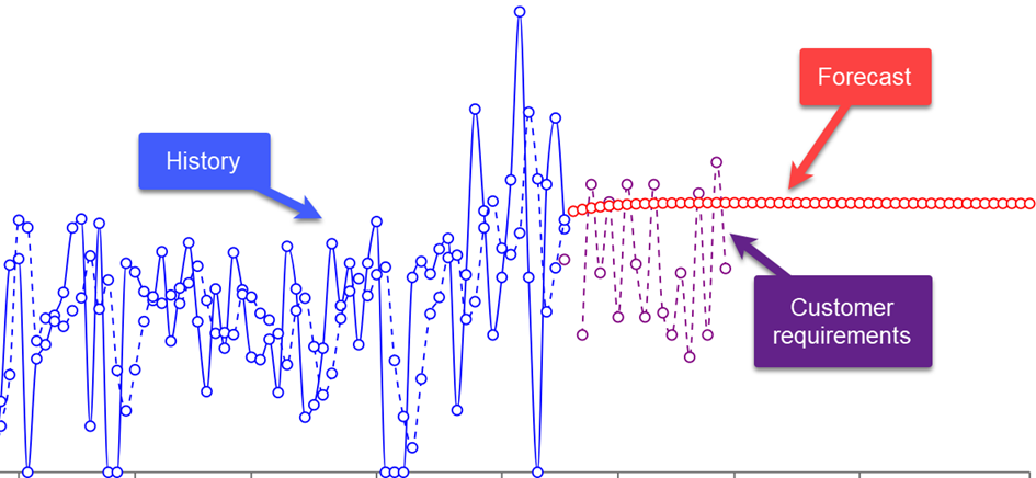 However, we are not necessarily going to blindly believe these figures. A customer requirement shared for the next 16 weeks is likely to change, and if we view this graph week after week, chances are we will see that the purple sinusoids fluctuate from week to week. The signal is undoubtedly better, but it is noisy. It is still a forecast, except for the very beginning of the horizon, where the customer delivery call is definitive.