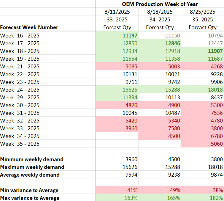 Green cells indicate periods where the forecasted demand signal was more than 15% above the average weekly demand in the 13 week horizon. Red cells indicate when the forecasted demand signal was more than 15% lower than the average weekly demand in the 13 week horizon.