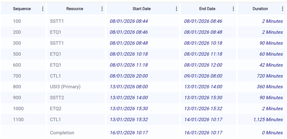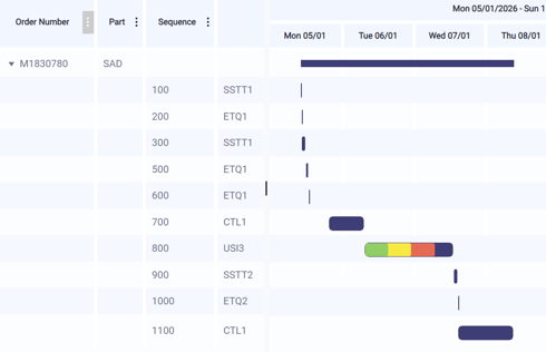 Prenons l’exemple ci-dessous. Votre algorithme magique a défini que l’opération 700 démarrera le 8 janvier à 20h et se terminera le 9 à 8h. Quelles sont les chances que ça se passe comme ça ? Elles sont probablement nulles – car les durées réelles d’opérations et les temps réels de réglage, sur cet OF et sur les autres ordres qui passent par les ressources en question, ne seront pas exactement conformes aux temps de gamme planifiés.