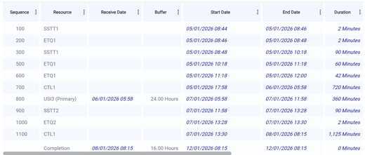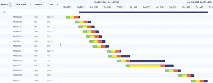 Si les temps de gamme ne sont pas respectés de l’opération 100 à 700, pas de souci : l’opération 800 est protégée par un buffer (une file d’attente) de 24h. Il n’y a pas de besoin de réordonnancement permanent, il faut juste respecter les priorités sur la ressource USI3.